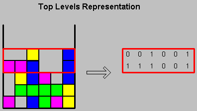 The second approach was to refer to the Top Two Levels (TTL) of the game. Defining M as the height of the highest column, this representation holds the information regarding rows number M-1 and M. In the reduced version of the game, this technique requires 4096 (=2^12) states. Though this representation does not hold information regarding rows, two and three levels from the top, it does include information regarding holes located one level from the surface. This approach was initially used by Melax.