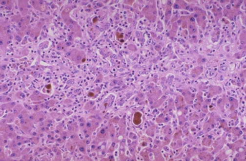 | Small brown-yellow bile plugs are seen here within hepatic canaliculi. The total serum bilirubin is increased and the patient demonstrates jaundice (icterus) on physical examination. The easiest place to see icterus is on the sclerae of the eyes. With obstruction or liver cell injury, the direct bilirubin is greater than indirect (unconjugated) bilirubin. With excessive RBC destruction (as with hemolysis), the indirect bilirubin is much greater than the direct bilirubin. |