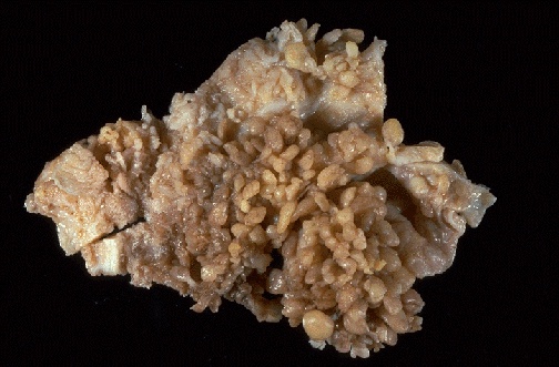 | This is synovial osteochondromatosis (derived from synovial chondromatosis) in which nodules of hyaline cartilage detach and float as loose bodies in the synovial cavity of a large joint such as the knee. Young to middle-aged males are mostly affected by this rare process. The nodules seen here can ossify before detaching and may increase in size over time. |