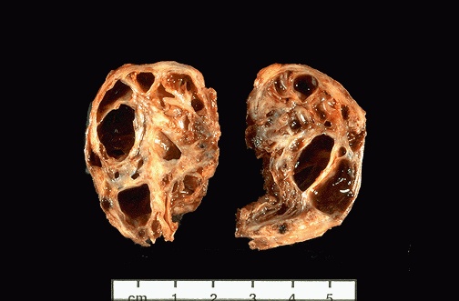 | The gross appearance of an aneurysmal bone cyst (ABC) is shown here. The radiographic appearance of an ABC is typically that of ballooning, or aneurysmal dilation, of the affected bone--usually the metaphysis of a long bone or dorsal vertebral body. Grossly, there are fleshy aggregates of tumor surrounding cystic spaces filled with blood. The breakdown of the blood into hemosiderin has led to brownish staining of some of the cysts seen here. |