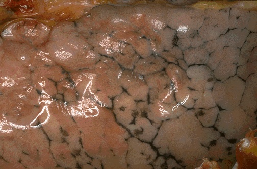 | The black streaks seen between lobules of lung beneath the pleural surface are due to accumulation of anthracotic pigment. This anthracosis of the lung is not harmful and comes from the carbonaceous material breathed in from dirty air typical of industrialized regions of the planet. Persons who smoke would have even more of this pigment. |