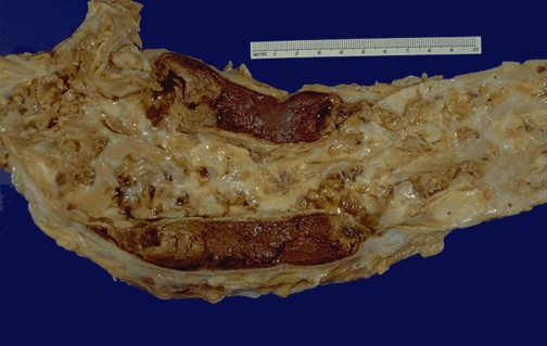| This aorta has been opened longitudinally to reveal an area of fairly limited dissection that is organizing. The red-brown thrombus can be seen in on both sides of the section as it extends around the aorta. The intimal tear would have been at the left. This creates a "double lumen" to the aorta. This aorta shows severe atherosclerosis which, along with cystic medial necrosis and hypertension, is a risk factor for dissection. |