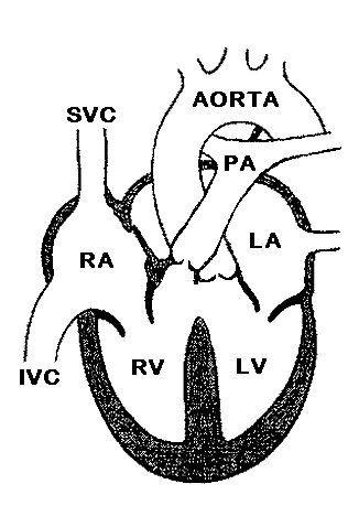| This diagram depicts a ventricular septal defect (VSD) in the membranous septum. There is a left-to-right shunt, the severity of which depends upon the size of the defect. VSD's may also occur in the muscular septum and may be multiple. Over time, about half will close spontaneously. Persons with VSD's (as with most cardiac defects) are at greater risk for infective endocarditis. |