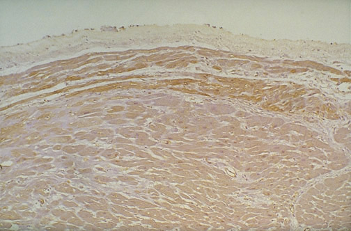 | The cardiac conduction system continues south from the AV node as the bundle of His beneath the endocardium. The more neural features of these fibers is brought out by this S100 immunohistochemical stain, which highlights the bundle of His in longitudinal section. Abnormalities of the conduction system may lead to arrhythmias. |