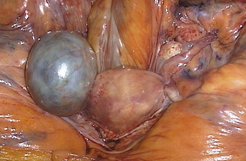 ![]() | Seen here in the pelvis adjacent to the uterus in the midline is a tumor of ovarian surface epithelium--a serous cystadenoma of the right ovary. The left ovary is atropic, consistent with a postmenopausal state. Such tumors can reach a large size because they do not impinge upon surrounding structures until they are quite large. They may cause some local discomfort. |