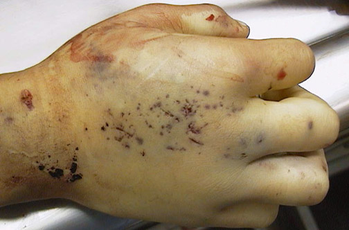 | Lacerations are made when a surface, such as the skin of the hand seen here, is cut in an irregular fashion down to the underlying tissue. An incision is defined as a very regular cut made by a sharp object such as a knife. Lacerations typically occur by contact with an irregular object. Lacerations are deeper than abrasions and more irregular than incised wounds. |
