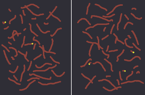 | The FISH technique requires viewing many cells to diminish artefactual problems in counting the painted chromosomes. FISH is good at identifying abnormal numbers of chromosomes such as trisomies and monosomies. FISH is also useful when probes are available for specific regions of chromosomes to determine if deletions, translocations, or duplications are present. In the above diagrams, a trisomy 21 is depicted at the right, while a probe for chromosome 22 has detected a translocation, probably to chromosome 9, on the left. |