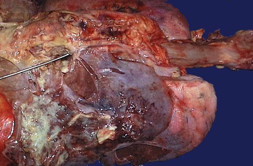 ![]() | Severe and/or prolonged vomiting may rarely be accompanied by lesions of the lower esophagus. If a mucosal tear with hemorrhage occurs, this is called Mallory Weiss syndrome. If the esophagus ruptures, this is known as Boerhaave syndrome. Seen here posteriorly is the upper esophagus and the lower esophagus with a probe at the site of rupture. After several days, purulent exudate is present over the right lung pleura (an empyema). Both of these syndromes have a high morbidity and mortality. |