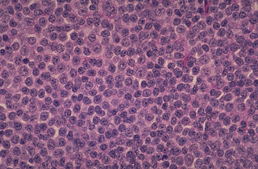 | Many non-Hodgkin lymphomas seen in adults are large cell lymphomas such as the one here at medium power, but they can be associated with immunosuppressed states (such as AIDS), and are most often of B cell origin. The cells are large, with prominent nucleoli and abundant cytoplasm. This disease tends to be localized (low stage), but with more rapid enlargement, and a greater propensity to be extranodal than the low grade lymphomas. |