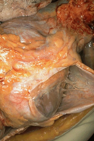 | Collection of fluid in a space is a transudate. If this fluid is protein-rich or has many cells then it becomes an exudate. The large amount of fibrin in such fluid can form a fibrinous exudate on body cavity surfaces. Here, the pericardial cavity has been opened to reveal a fibrinous pericarditis with strands of stringy pale fibrin between visceral and parietal pericardium. |