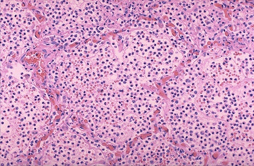 | At medium power magnification, numerous neutrophils fill the alveoli in this case of acute bronchopneumonia in a patient with a high fever. Pseudomonas aeruginosa was cultured from sputum. Note the dilated capillaries in the alveolar walls from vasodilation with the acute inflammatory process. |