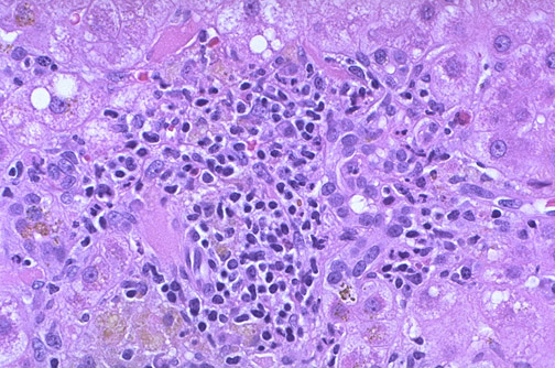 | At high magnification, a bile duct is being demolished by lymphocytes in this case of primary biliary cirrhosis (PBC). A characteristic laboratory finding with PBC is antimitochondrial antibody (AMA) in serum. Other findings in serum include: increased alkaline phosphatase, hypercholesterolemia, and hypergammaglobulinemia. Micronodular cirrhosis ensues. Jaundice is a late finding that suggests incipient liver failure. Patients sometimes have other autoimmune phenomena. |