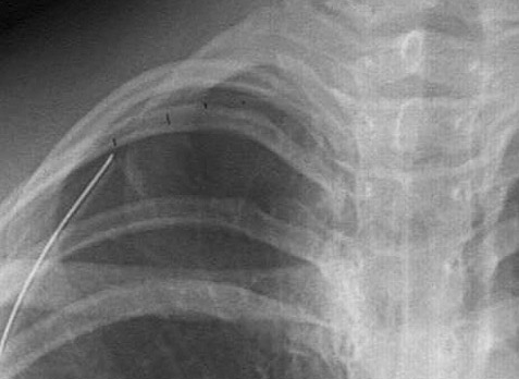 | The radiograph above demonstrates a pneumothorax on the right, with the mediastinum and heart shifted to the left. A pneumothorax results from rupture of the lung or a penetrating injury to the chest wall that allows air to enter the pleural cavity. A chest tube has been inserted here to help re-expand the lung. The faint border of the displaced visceral pleura surface is marked in the radiograph below. |