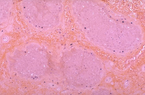 | This is the microscopic appearance of testicular torsion. In this case, the condition has proceeded to hemorrhagic infarction with no viable seminiferous tubules remaining. Note the outlines of the tubules remaining, but there is loss of nuclear detail, and the interstitium is hemorrhagic. |