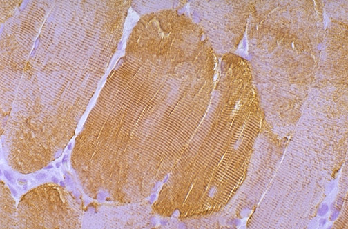 | This is normal skeletal muscle with immunohistochemical staining using antibody to desmin. Desmin, along with vimentin, is an "intermediate" filament between the size of thin actin and thick myosin. Both desmin and vimentin secure the periphery of Z disks to adjacent myofibrils. Another protein, dystrophin, binds actin and aids in attaching bundles of myofibrils to the sarcolemma. |