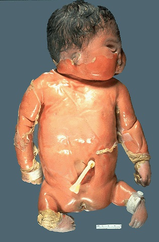 | The first thing to notice is the features of intrauterine fetal demise: skin slippage and reddening. These features are those of maceration and not trauma or birth defect. Note the shortened lower extremities, known as phocomelia. It was idiopathic in this case, but in the 1950's the drug thalidomide was responsible for many cases when pregnant women took it. Thus, it is very important that pregnant mothers be advised that drugs (including cigarette smoking and alcohol consumption) may have profound effects on the fetus. |