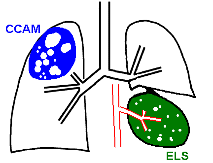 | This diagram illustrates the appearance of pulmonary extralobar sequestration (ELS) and congenital cystic adenomatoid malformation (CCAM). With CCAM, there is a mass lesion with cystic and solid components. The ELS, which typically lacks a bronchial connection, also acts as a mass, but is a portion of lung that typically has a blood supply from the aorta. |