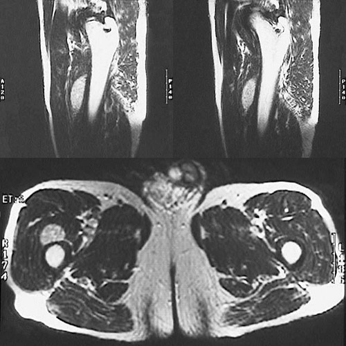 | This is a magnetic resonance imaging (MRI) scan of the legs that reveals a circumscribed soft tissue mass arising in the thigh region just anterior to the femur (the fatty marrow is bright and the bone cortex is dark). Soft tissue tumors are difficult to diagnose. Though relatively small in size, this mass proved to be a sarcoma. |