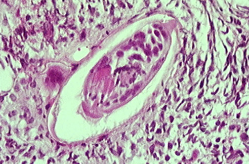 | Here is a Schistosoma hematobium egg with a terminal spine. The presence of many S. hematobium eggs incites an inflammatory reaction which can lead to bladder wall fibrosis and calcification. The chronic inflammation can lead to squamous metaplasia and increase the risk for squamous cell carcinoma of the bladder. This particular parasitic infection is endemic to Africa and the Near East, where the definitive snail hosts live. [Image courtesy of Dr. Ilan Hammel, Tel Aviv University] |