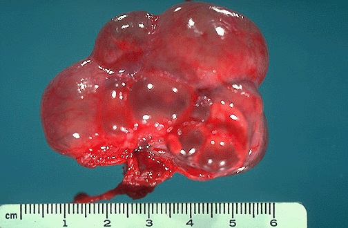| This is a multicystic dysplastic kidney. This condition must be distinguished from ARPKD because it occurs only sporadically and not with a defined inheritance pattern, though it is more common than ARPKD. The cysts of multicystic renal dysplasia are larger and more variably sized than those of ARPKD. Often, multicystic renal dysplasia is unilateral. If bilateral, it is often asymmetric. If bilateral, oligohydramnios and its complications can ensue, just as with ARPKD. |