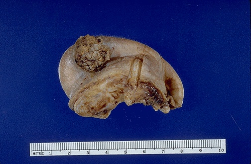 | Here is a squamous cell carcinoma on the posterior aspect of the external ear. This lesion has a rough irregular brown surface. It invades into the underlying cartilage. Squamous cell carcinomas may arise in sun-exposed skin. The surrounding skin may show actinic keratoses (premalignant actinic change from sun damage to the epidermis). These lesions typically grow and invade slowly over time and rarely metastasize. |
