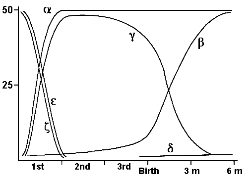 Formation of globin chains varies in fetal to adult life. The diagram below indicates the relative proportions (in % of total globin) of the various globin chains from conception to six months of age. Note that the epsilon and zeta chains are normally present only in the first trimester in utero.