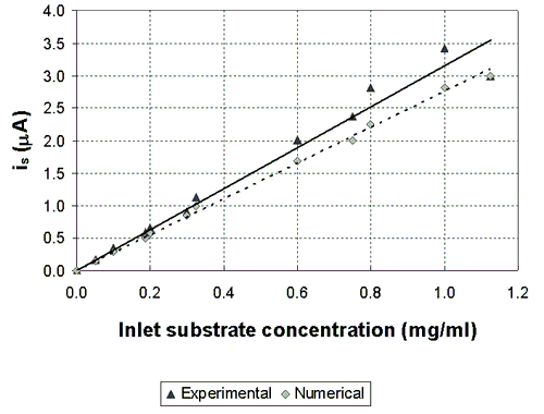 The present research examines numerically and experimentally the identification of substrate concentration in amperometric electrochemical flow cells. Three dimensional numerical simulations have been preformed for predicting the mass transfer processes in the vicinity of the cell using a realistic geometrical model of the cell. For the optimization of the inlet flow rate, numerical simulations and experiments have been preformed using identical substrate concentration (see fig. 1). The numerical simulation results were used to evaluate the species concentration distribution in the vicinity of the cell for predicting the electric current through the electrode. A good agreement was found between the numerical and the experimental electric current evolution values, especially for the higher substrate concentrations. The correlation coefficient was 0.98 in the higher substrate concentrations. A linear relationship was obtained between the inlet substrate concentration and the steady state electric current for both the numerical and the experimental results (see fig. 2). Once this linear relationship is established, the inlet substrate concentration based on the electric current through the electrode can be established.