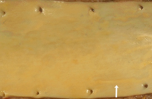 | Put down that extra slice of pizza and look carefully at this aorta. The white arrow denotes the most prominent fatty streak in the photo, but there are other fatty streaks scattered over the aortic surface. Fatty streaks are the earliest lesions seen with atherosclerosis in arteries. Increased total cholesterol and decreased HDL cholesterol contribute to this process. |