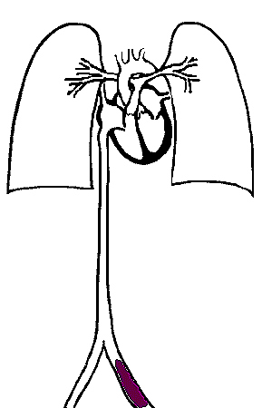 A pulmonary thromboembolus travels from a large vein in the leg up the inferior vena cava to the main pulmonary arteries as they branch. Such thrombi embolize most often from large veins in the legs and pelvis where thrombi form with stasis.
