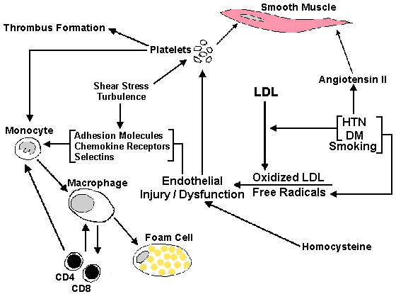 The risk factors for atherosclerosis are diagrammed here in relation to the mechanisms that favor development of arterial atheroma formation.