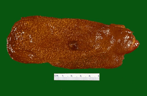 | Here is cholesterolosis of the gallbladder along with a solitary rounded gallstone. Obviously, this stone is not large enough to erode the mucosa; it is probably a bit too large to pass down the cystic duct as well. It is rounded because there are no other stones present to mold it. |