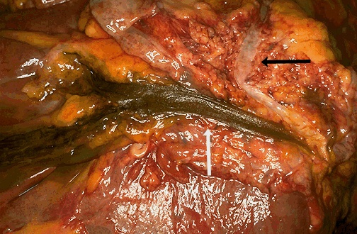 | The common bile duct appears above the white arrow, and branches into the cystic duct (lower) and hepatic duct (higher) at the left. The black arrow appears to the right of the pancreatic duct. Both the pancreatic duct and the common bile duct merge at the ampulla at the lower right. This anatomic configuration, present in most persons, makes pancreatitis from gallstones impacting in the ampulla of Vater possible. |