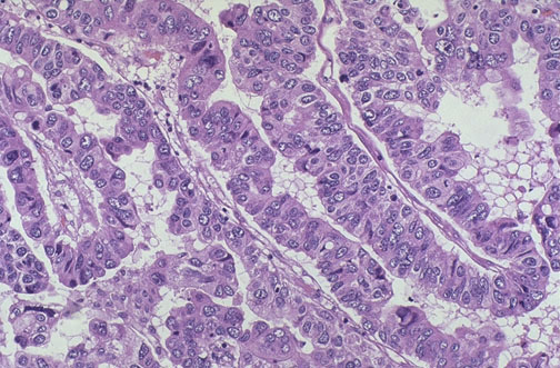 | At high magnifcation, this adenocarcinoma of the gallbladder is seen to be composed of columnar cells forming glandular and papillary structures. The prognosis with adenocarcinoma of the gallbladder is usually poor, because they have often invaded and metastasized by the time they are discovered. |
