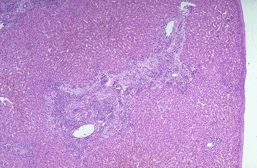 | The portal tracts in this liver are swollen and contain proliferated bile ducts along with a predominantly neutrophilic inflammatory infiltrate. This is an example of obstructive jaundice from a disease process external to the liver, in this case an adenocarcinoma of the head of the pancreas obstructing the common duct near the ampulla. |