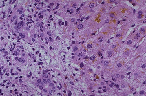 | In this case of extrahepatic biliary tract obstruction, the total bilirubin was 8.0 mg/dL with direct bilirubin of 7.2 mg/dL. The alkaline phosphatase was also elevated. The liver here shows prominent intracellular as well as canalicular cholestasis. |