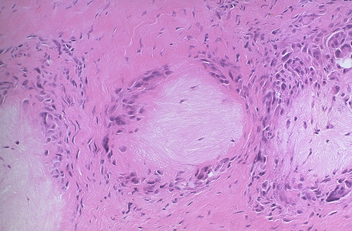 | The pale areas seen here are tophi, or aggregates of urate crystals surrounded by infiltrates of lymphocytes, macrophages, and foreign body giant cells. A tophus is the characteristic finding of gout. Tophi are most likely to be found in soft tissues, including tendons and ligaments, around joints. Less commonly tophi appear elsewhere. Tophaceous gout results from continued precipitation of sodium urate crystals during attacks of acute gout. |