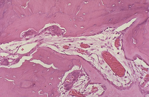 ![]() | This is Paget disease of bone in which the mixed osteoclastic and osteoblastic stage is present. A line of osteoblasts is present forming new bone, but lacunae containing multinucleate osteoclasts are at the same time destroying bone. The result is a patchwork mosaic of bone without an evenly formed lamellar structure. This stage of Paget disease is preceded by a mainly lytic phase and is followed by a "burnt out" sclerotic phase. |