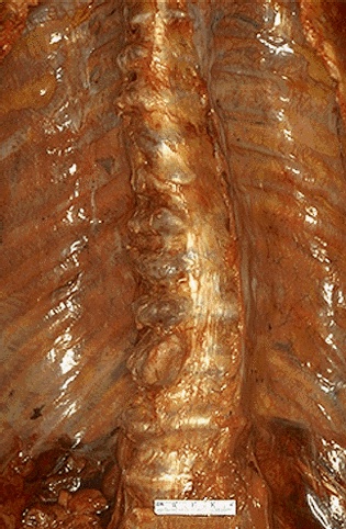 | Here is another example of degenerative osteoarthritis in which there is prominent "lipping" of the vertebrae. Osteoarthritis increases with age beyond 50. Generally, a few large joints are involved, such as hip or knee. Osteoarthritis is due to wear and tear with loss of articular cartilage. Note also that there is a curve to the right indicating a minor degree of scoliosis. |
