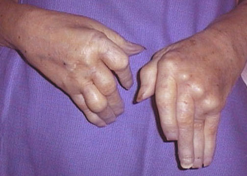 | The prominent ulnar deviation of the hands and "swan neck" deformity of the fingers seen here is due to rheumatoid arthritis (RA). This autoimmune disease leads to synovial proliferation with inflammation and joint destruction, typically in a symmetrical pattern involving small joints of hands and feet, followed by wrists, ankles, elbows, and knees. Rheumatoid factor can be identified serologically in most, but not all, RA patients. |