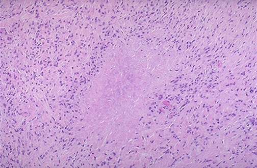 | Here is a rheumatoid nodule. Such nodules are seen in patients with severe rheumatoid arthritis and appear beneath the skin over bony prominences such as the elbow. They can occasionally appear in visceral organs. There is a central area of fibrinoid necrosis surrounded by pallisading epithelioid macrophages. and other mononuclear cells. |