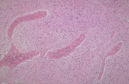 ![]() | Fibrous dysplasia of bone is a non-neoplastic process in which there is a localized area in which irregular woven bone proliferates but does not develop into solid lamellar bone, leaving a weakened area that can produce deformity or fracture. Most cases are monostotic, involving a single area in adolescence. Polyostotic forms often appear earlier in childhood and persist later into adulthood. The McCune-Albright syndrome consists of polyostotic fibrous dysplasia in conjunction with cafe-au-lait spots on the skin and disorders of the endocrine system. In the low power view above and medium power view below, there are irregular spicules of woven bone in a cellular stroma. |