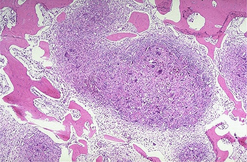 | Here is a "brown tumor" of bone in a patient with hyperparathyroidism. The high parathormone levels increase osteoclast activity in bone and produce irregular bone resorbtion with microfractures and hemorrhage and macrophage proliferation and fibrous connective tissue proliferation. |