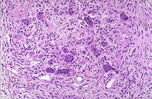 | The center of the "brown tumor" contains osteoclasts and mononuclear cells and fibroblasts with focal hemorrhages. The hemosiderin from the hemorrhage produces the grossly brown color. Such lesions are nowadays uncommon because hyperparathyroidism is treated before such lesions develop. |