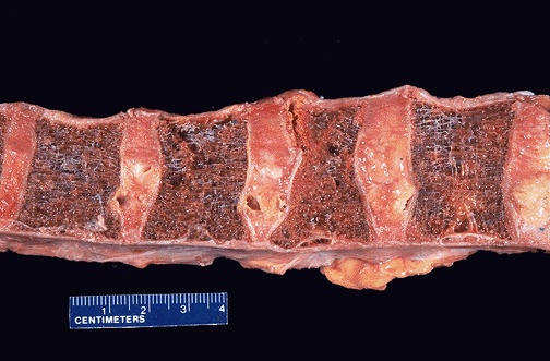 | The bone in these vertebral bodies demonstrates marked osteoporosis with thinning and loss of bony trabeculae. The second body from the right shows a greater degree of compression than the others. Osteoporosis is accelerated bone loss with age and is particularly common amongst postmenopausal women, putting them at risk for fractures (hip, wrist, vertebrae). |