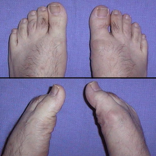 ![]() | Osteoarthritis is a common problem, and its frequency increases with aging. One or more joints can be affected. Joints subjected to stressful "wear and tear" and weight-bearing are more prone to damage to hyaline cartilage. Seen here is a more prominent right first metatarsal-phalagneal joint from narrowing and flattening of articular surfaces, with reduced range of motion. |