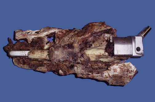 | An infection that becomes established in bone is difficult to treat, since bone is relatively avascular. The result is an osteomyelitis. If this process occurs over years, the bone becomes markedly remodelled. At the site of involvement, there is a cental area of pale necrotic "sequestrum" that is surrounded by irregular remodelled "involucrum" that produces marked distortion. The weakened bone is prone to fracture. In this case, the irregular involucrum is seen above in the upper femur. In the view below, the sequestrum is seen around the metallic prosthesis used to stabilize a femur at the hip. |