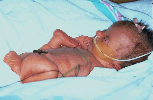 | This baby's extremities are positioned oddly because there have been multiple fractures due to osteogenesis imperfecta (OI). This disease leads to multiple fractures. The basic problem is a defect in the formation of type 1 collagen that forms bone matrix. There are several types of OI with different inheritance patterns. |