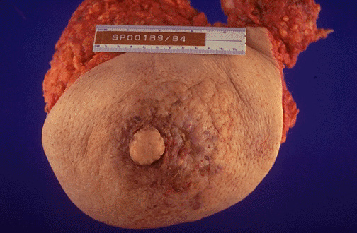 | This mastectomy specimen demonstrates the gross findings of "inflammatory" carcinoma of breast. This is not a specific histologic type of breast cancer, but rather it implies dermal lymphatic invasion by some type of underlying breast carcinoma. Such involvement of dermal lymphatics gives the grossly thickened, erythematous, and rough skin surface with the appearance of an orange peel ("peau d'orange" for you francophiles). |