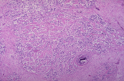 | This is infiltrating ductal carcinoma of breast. Note the infiltration of ill-defined glands into the surrounding collagenous stroma. There is also a small microcalcification at the lower right of center, a finding that could be seen by mammography. About 65 to 80% of breast cancers are of this type. |