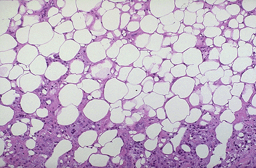 | This is fat necrosis of the breast. The most common etiology is trauma. It can be a localized, firm area with scarring that can mimic a breast carcinoma. Microscopically, however, fat necrosis consists of irregular steatocytes with no peripheral nuclei and intervening pink amorphous necrotic material and inflammatory cells, including foreign body giant cells responding to the necrotic fat cells. |